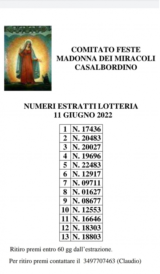 Nulla accade per caso o fato e tutto è frutto del fatto che c’è chi si impegna, dona tempo ed impegno, fatica per la collettività. E la grandissima festa di questi giorni non è, ovviamente, esente: tutto è stato possibile perché ci sono stati tanti cittadini che l’hanno costruita ed organizzata dall’inizio alla fine meticolosamente. Un impegno generoso e appassionato, fedele e straordinario da parte del Comitato Feste Madonna dei Miracoli che ha donato questi due bellissimi giorni di devozione e divertimento, di convivialità e socialità. Un lavoro tenace ed instancabile che ha bisogno di supporto, sostegno, mezzi adeguati da parte di tutta la comunità. Non bisogna mai dimenticarlo e, anzi, ringraziare sempre il cuore e l’impegno. Durante la questua dei mesi precedenti, quando per settimane sono state battute tutte le strade di Casalbordino, e negli altri momenti in cui è stata chiesta la collaborazione e la partecipazione. Uno dei mezzi tradizionalmente utilizzati per raccogliere fondi e sostenere le feste è la lotteria.