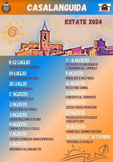Il Comune di Casalanguida è lieto di presentare il calendario degli eventi estivi per il 2024. Quest'anno, la nostra comunità si prepara a vivere un'estate straordinaria, ricca di manifestazioni culturali, ricreative e sportive, culminando con il ritorno dell'atteso Magn Biv e N'gì Pinzà .