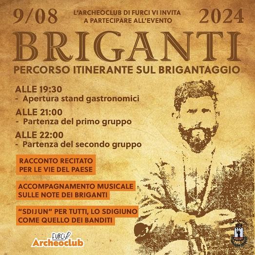 L’Archeoclub di Furci, per ricordare questa pagina della storia dell’alto vastese, ha organizzato un percorso itinerante sul brigantaggio nel centro storico del paese. Appuntamento alle 19.30 in piazza Umberto I con l’apertura degli stand gastronomici, alle 21 partirà il primo gruppo per il racconto recitato per le vie del paese con accompagnamento musicale sulle note delle canzoni tipiche dei briganti e alle 22 partirà il secondo gruppo. Ai partecipanti verrà offerto lo “sdijun”, lo sdigiuno dei banditi.