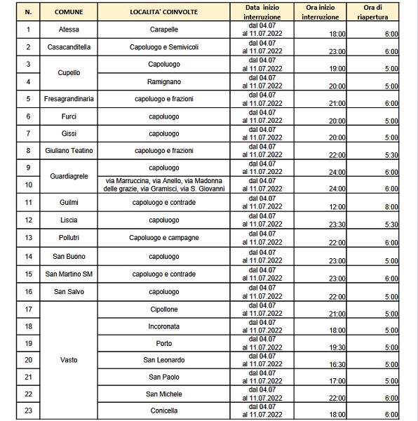 In occasione della pubblicazione di questo cronoprogramma la Sasi ha comunicato che “a seguito di segnalazione di controlli interni riconducibili a situazioni di disagio per gli utenti nelle ore di maggior consumo della risorsa idrica” si sono resi necessari altri interventi non differibili di interruzione che hanno coinvolto nel nostro comprensorio Casalbordino la scorsa notte e Cupello ieri pomeriggio.