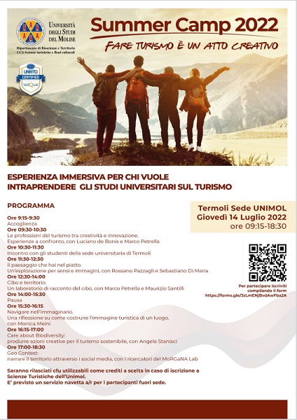 Fare turismo è un atto creativo, questo è il nome del Summer Camp 2022 organizzato dal Dipartimento di Bioscienze e Territorio dell'Università degli Studi del Molise, che offre, a chiunque sia interessato ad intraprendere studi sul turismo, un'occasione per confrontarsi con esperti nel campo della valorizzazione turistica dei territori e per conoscere la struttura universitaria di Termoli.