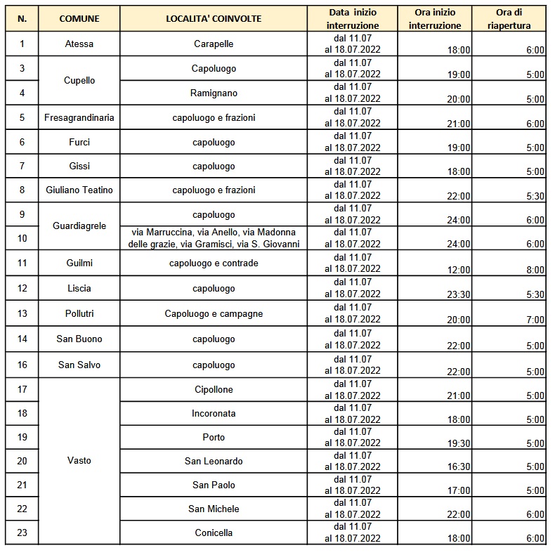 “A causa di una rottura dell’adduttrice principale in C.da Fontanelle nel Comune di Casalbordino, si comunica che nella giornata odierna verranno eseguiti i lavori di riparazione”, si legge in un avviso odierno della Sasi, è in corso “la sospensione della normale fornitura idrica dalle ore 13.00 di oggi 12 Luglio 2022 fino alle ore notturne della medesima giornata nei comuni di Casalbordino e Villalfonsina”.