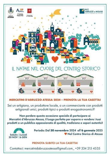 Oltre a questa iniziativa l’Assessore alle Attività produttive del Comune di Atessa fa sapere che per il Natale 2024 saranno presenti, nei temporary shop del Centro Storico di Atessa, a seguito di un accordo con l’Ente Artigianato artistico di Guardiagrele, i manufatti degli artisti abruzzesi con esposizione e vendita delle opere artigianali. Ferro battuto di Guardiagrele, ceramiche di Castelli, arte orafa sulmonese, poi artigiani di Scanno, Pescara, Teramo, L’Aquila e da tutto l’Abruzzo saranno dislocati nei locali sfitti di Corso Vittorio Emanuele II.
