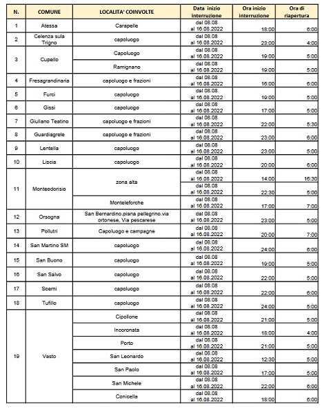 Nello stesso avviso pubblicato online la società ha informato che “a seguito di segnalazione di controlli interni riconducibili a situazioni di disagio per gli utenti nelle ore di maggior consumo della risorsa idrica, si necessita, oltre alle interruzioni settimanali già programmate in allegato, di un intervento di interruzione della fornitura non differibile”. Intervento che ha coinvolto i comuni di Cupello e Casalbordino