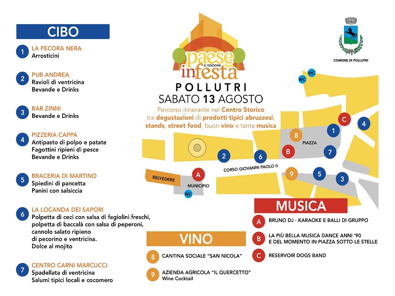 “Paese in festa - Musica &...”, patrocinato dal Comune di Pollutri e che si svolgerà nel centro storico del paese, “inizierà alle ore 20.00 con l'apertura degli stand – rende noto il comunicato inviato dall’Amministrazione Comunale - sono previsti stand con prodotti tipici abruzzesi per tutti i gusti, dai primi a base di carne e di pesce alla ventricina, agli arrosticini e tanto altro ancora e non mancherà il buon vino pollutrese” e ci sarà “spazio anche per la musica: Reservoir Dogs Band, Bruno DJ - karaoke e balli di gruppo e 90 allora - la musica più bella degli anni 90 e del momento”.