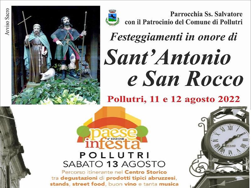 Questa settimana a Pollutri si tornerà a vivere due appuntamenti tradizionali della vita della comunità: la festa in onore di San Rocco e Sant’Antonio e “Paese in festa - Musica &...” che giunge, così, alla sua sesta edizione. San Rocco e Sant’Antonio verranno celebrati l’11 e 12 agosto mentre “Paese in festa - Musica &...” concluderà la sera del 13 agosto questa settimana.