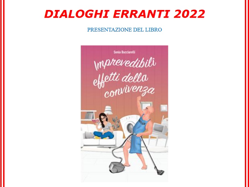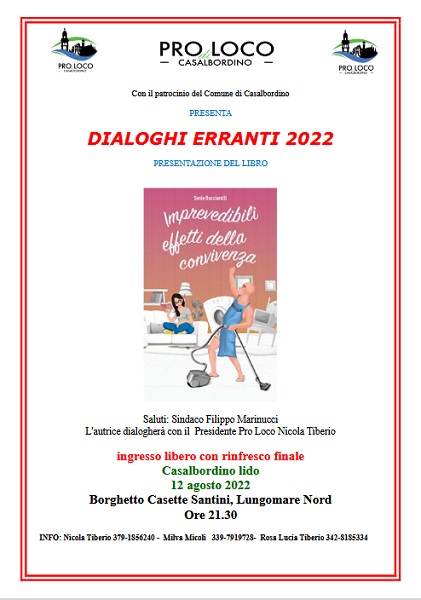 Prosegue il ciclo letterario “Dialoghi erranti” organizzato dalla Pro Loco di Casalbordino e patrocinato dal Comune di Casalbordino, inserito nel calendario delle manifestazioni estive 2022. Dopo l’intensa serata con il prof. Bucci e la presentazione del suo libro “Il tempo dell’attesa” nuovo incontro presso Casette Santini sul lungomare nord di Casalbordino. Appuntamento domani sera alle ore 21.30 con la presentazione del libro “Effetti della convivenza” di Sonia Bucciarelli. Dopo i saluti istituzionali del sindaco Filippo Marinucci l’autrice dialogherà con il presidente della Pro Loco Nicola Tiberio.