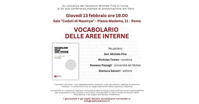 Il Vocabolario delle aree interne. 100 parole per l’uguaglianza dei territori, su volonta del senatore del Partito Democratico Michele Fina, sarà presentato al Senato della Repubblica giovedì 13 febbraio alle 19, presso la Sala Caduti di Nassirya. Il libro curato dallo studioso vastese Nicholas Tomeo, dottorando dell’Università del Molise, e pubblicato nel 2024 da Radici edizioni, raccoglie i contributi di oltre sessanta contributori tra docenti, ricercatrici, dottorandi, giornaliste, amministratrici locali, scrittori che emergono nell’insieme come una nuova comunità esploratrice. Frutto di un lavoro collettivo e transdisciplinare che racchiude in cento parole la condizione e le potenzialità delle aree interne italiane, il loro declino e le loro strategie di rinascita, il Vocabolario ha suscitato grande interesse e riscosso un importante successo nazionale, tanto da essere già giunto, a soli pochi mesi dall'uscita, alla seconda edizione.