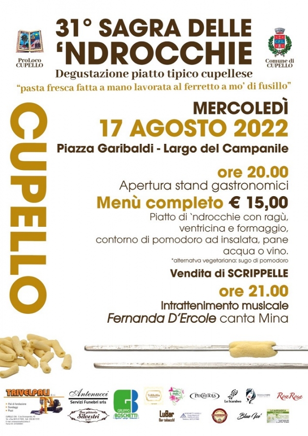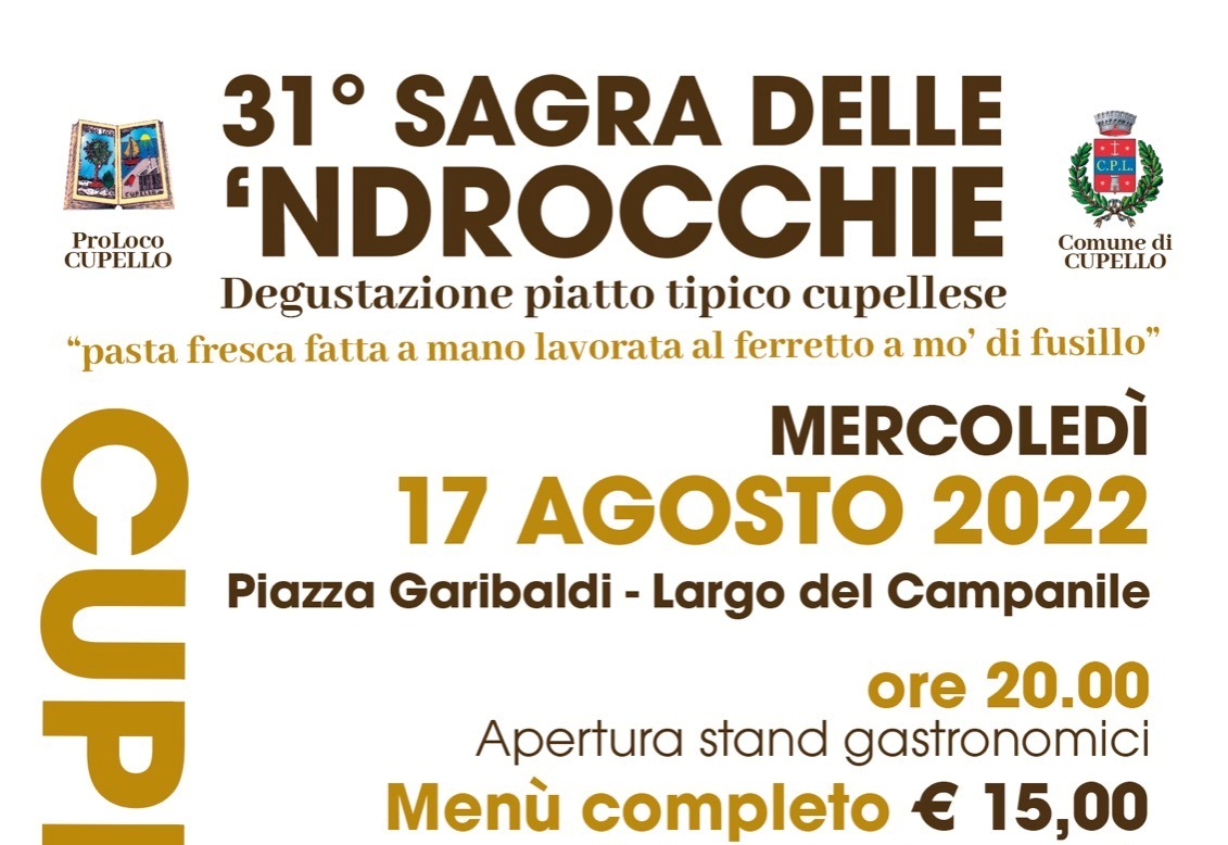 Countdown terminato e tutto più che pronto per la 31esima edizione della Sagra delle ‘Ndrocchie, la tipica pasta cupellese fatta a mano con il ferretto a mo' di fusillo.