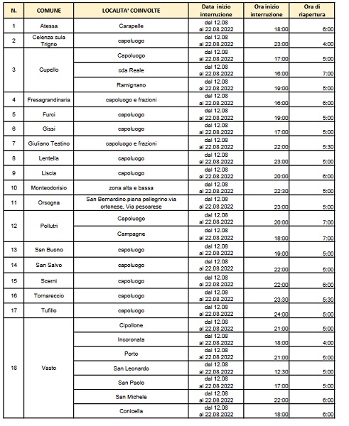 Siamo nel pieno della nuova programmazione delle chiusure, settimanalmente disposto dalla Sasi, “al fine di evitare disservizio” come pubblicato nell’avviso che con regolare cadenza viene pubblicato all’inizio di ogni settimana. Per la coincidenza del Ferragosto, questa settimana anticipato al 12 agosto. Cronoprogramma fino al 22 agosto che coinvolge nel nostro comprensorio i comuni di Cupello, Fresagrandinaria, Furci, Gissi, Monteodorisio, Pollutri, San Buono, San Salvo, Scerni, Tufillo e Vasto